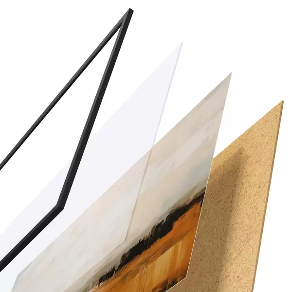 Das Poster besteht aus einem Rahmen, Plexiglas, einem gedruckten Bild und einer Rückwand aus Spanplatten. Dank der Halterungen auf der Rückseite kann das Poster sofort an die Wand gehängt werden.