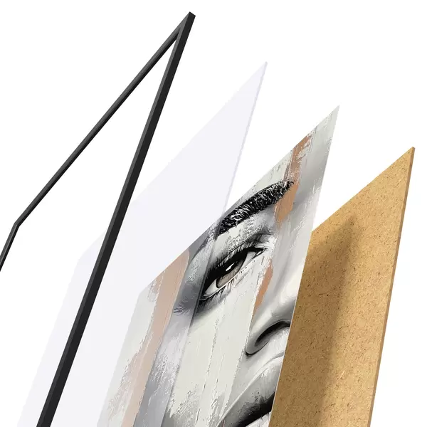 Das Poster besteht aus einem Rahmen, Plexiglas, einem gedruckten Bild und einer Rückwand aus Spanplatten. Dank der Halterungen auf der Rückseite kann das Poster sofort an die Wand gehängt werden.