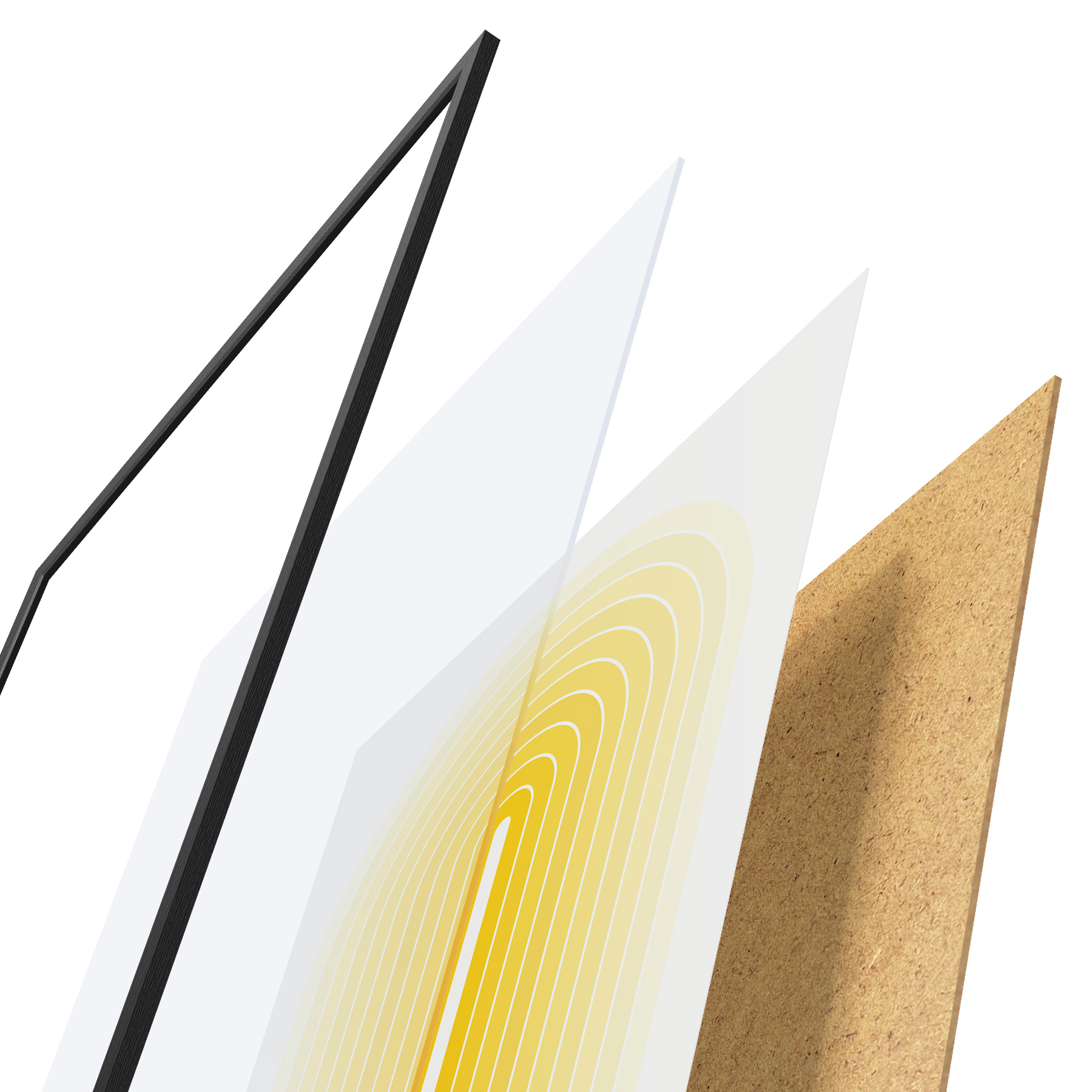 Das Poster besteht aus einem Rahmen, Plexiglas, einem gedruckten Bild und einer Rückwand aus Spanplatten. Dank der Halterungen auf der Rückseite kann das Poster sofort an die Wand gehängt werden.