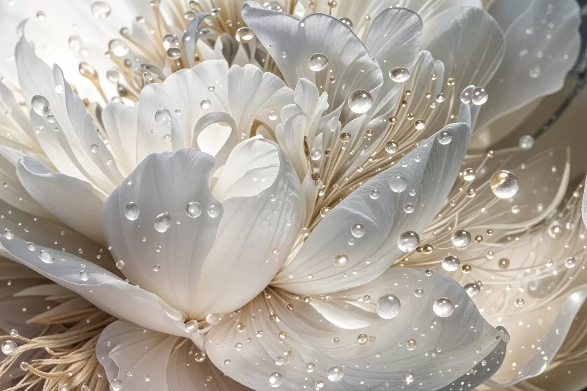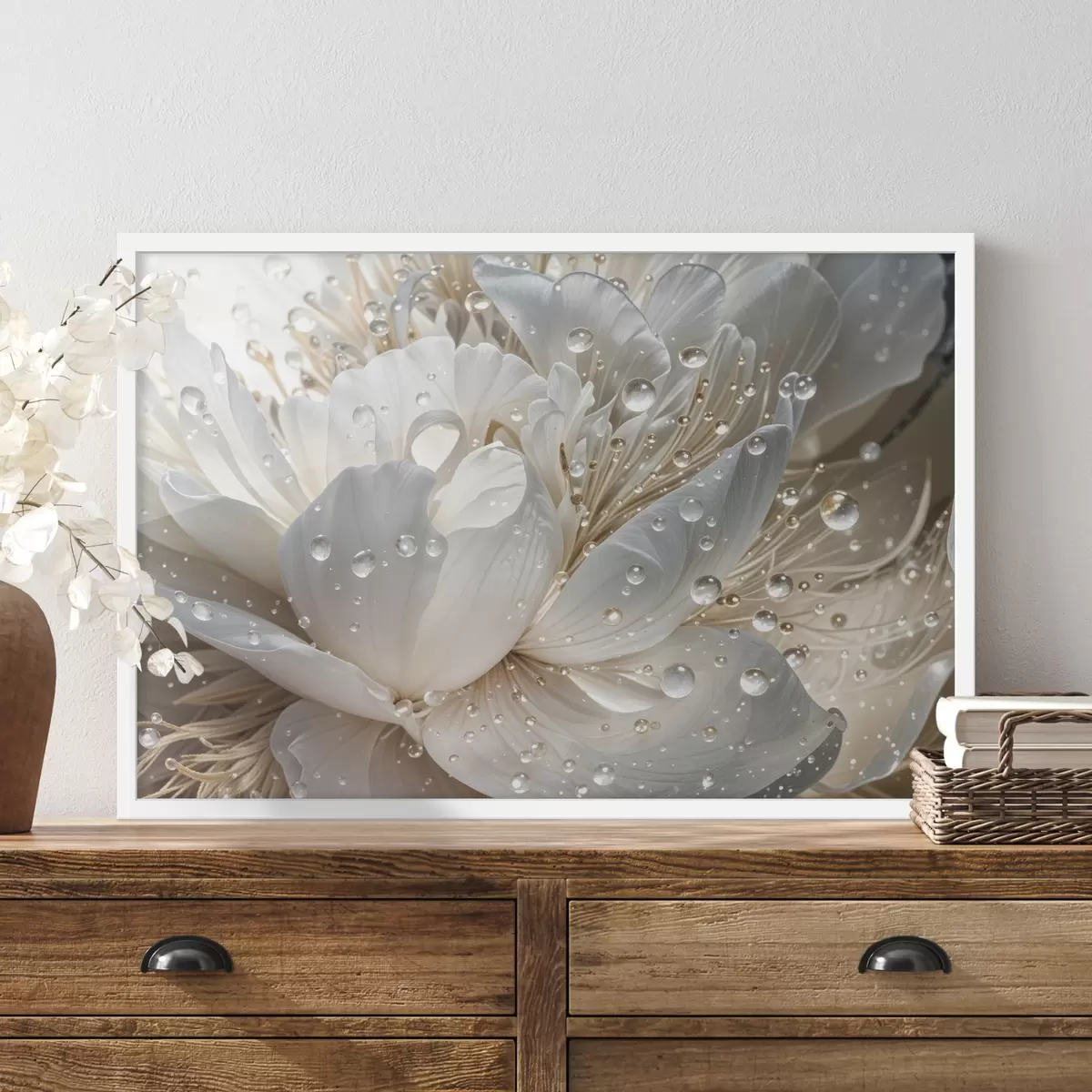 Poster Eine Nahaufnahme einer weißen Pfingstrose mit Wassertropfen auf den Blütenblättern vor einem unscharfen Hintergrund Nr f40539