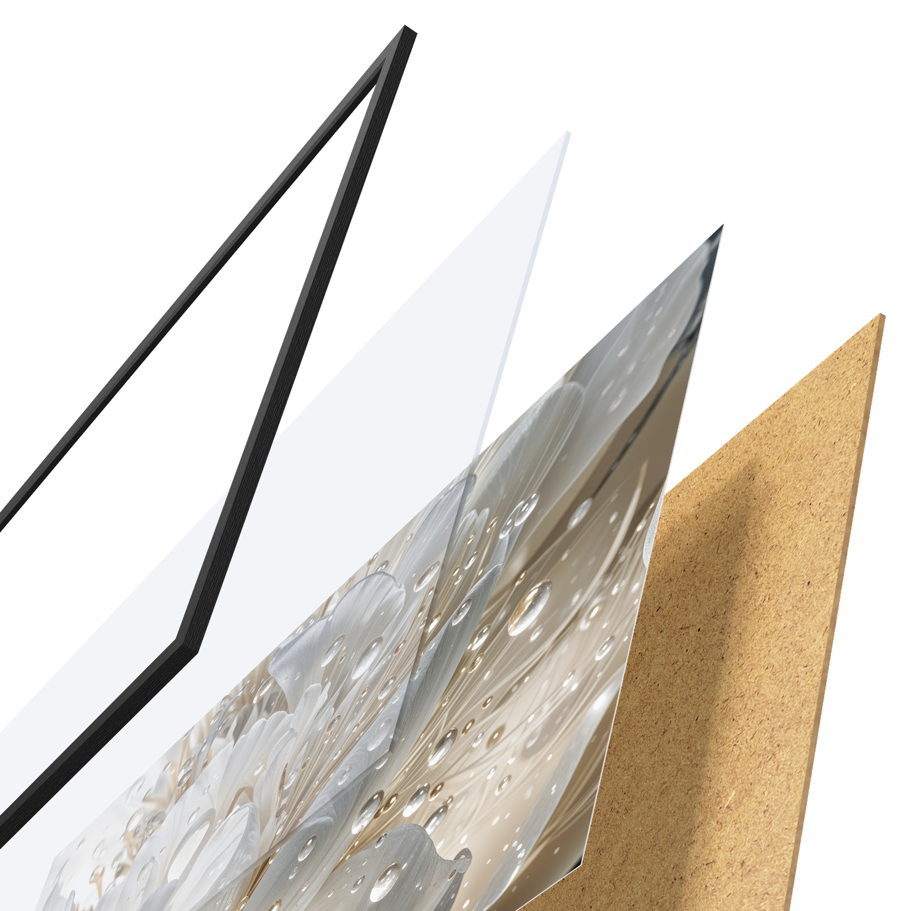 Das Poster besteht aus einem Rahmen, Plexiglas, einem gedruckten Bild und einer Rückwand aus Spanplatten. Dank der Halterungen auf der Rückseite kann das Poster sofort an die Wand gehängt werden.