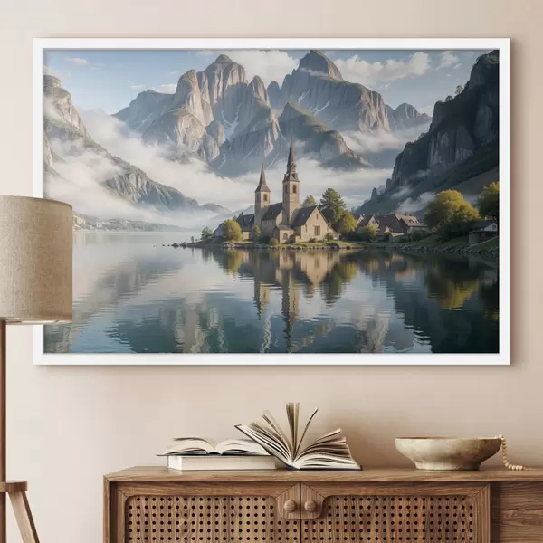 Poster Ein malerisches Bergdorf an einem ruhigen See mit hoch aufragenden schneebedeckten Bergen f40554