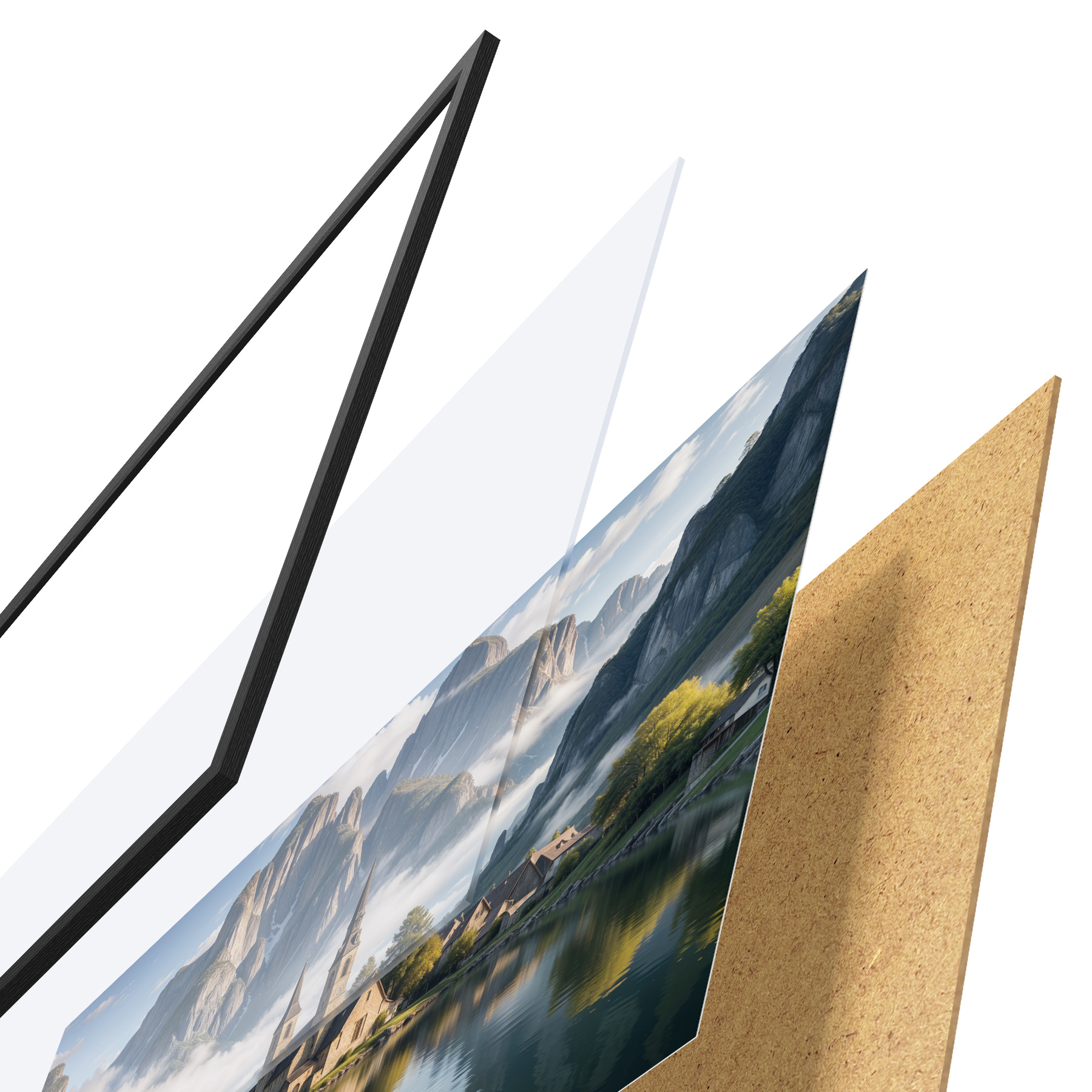 Das Poster besteht aus einem Rahmen, Plexiglas, einem gedruckten Bild und einer Rückwand aus Spanplatten. Dank der Halterungen auf der Rückseite kann das Poster sofort an die Wand gehängt werden.