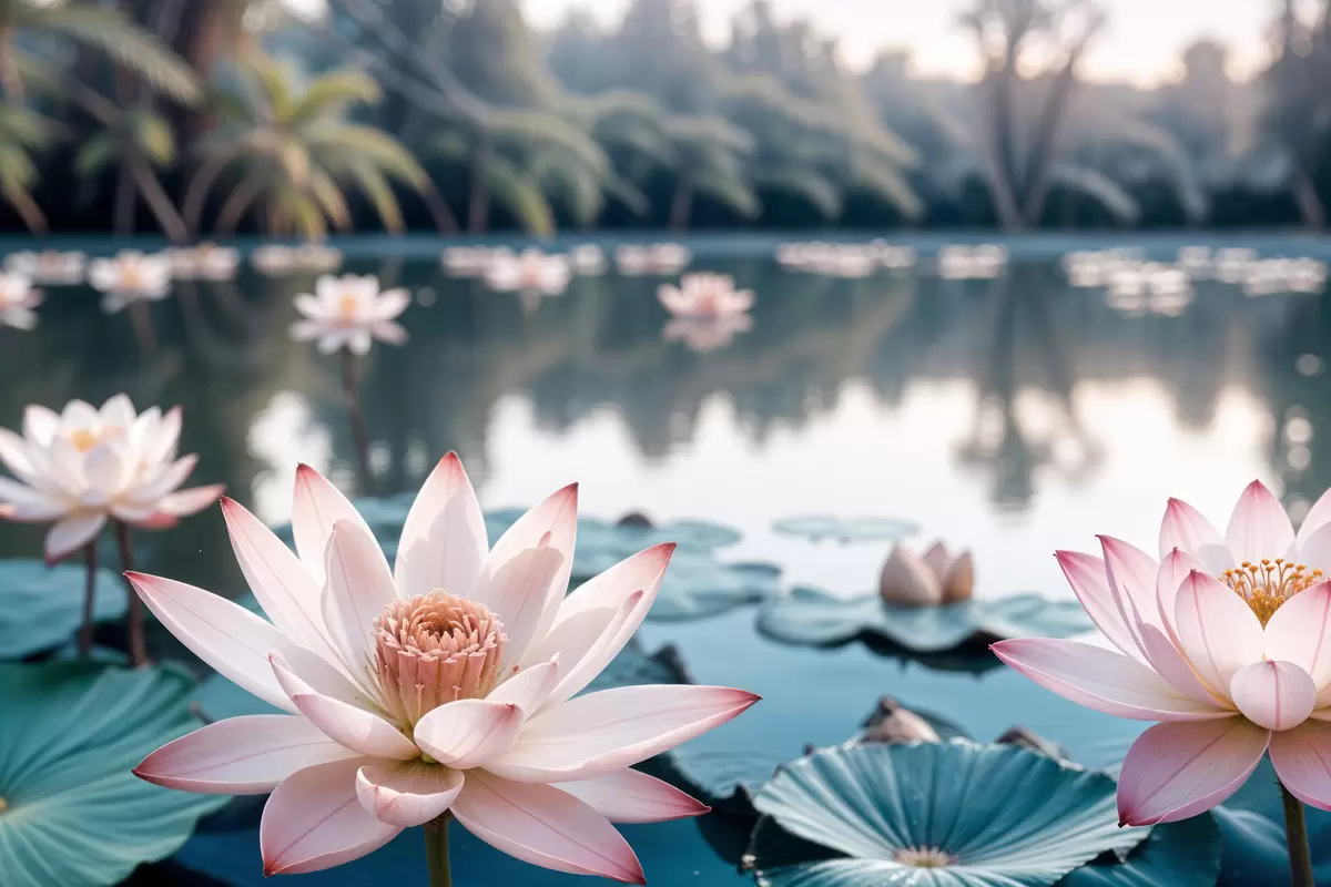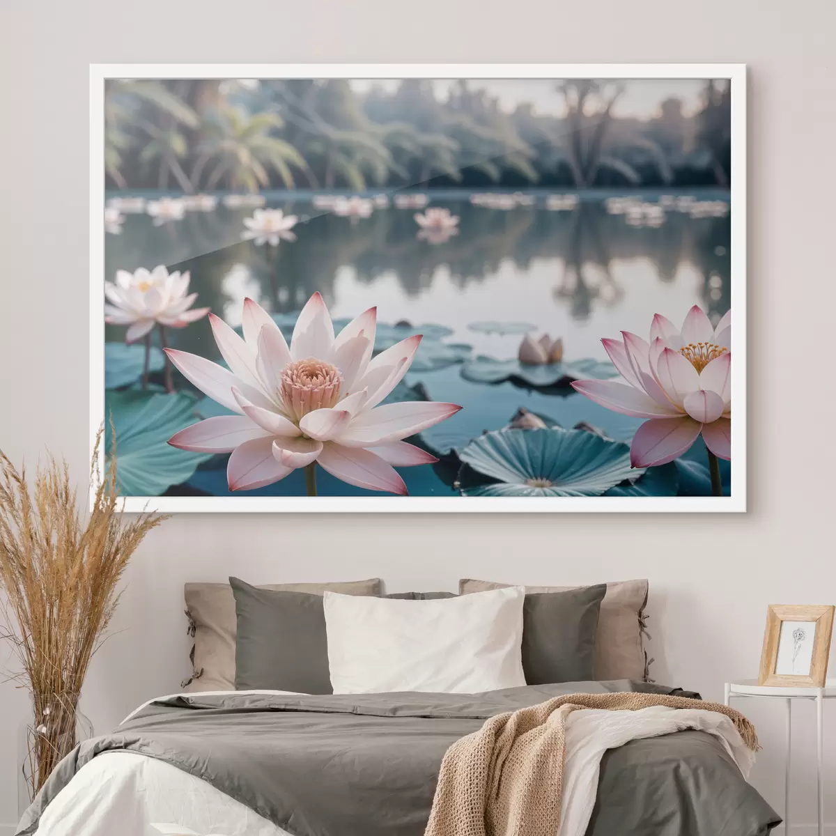 Poster Ein Teich mit rosa Lotusblüten, die auf der Oberfläche schwimmen, umgeben von üppigem Grün und Palmen Nr f40555