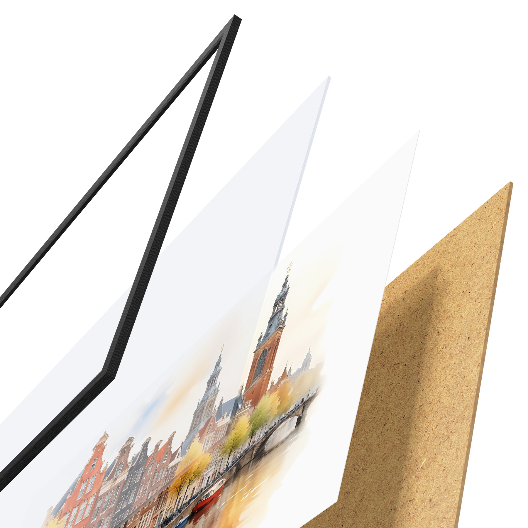 Poster Eine farbenfrohe Aquarell-Stadtansicht von Amsterdam mit traditionellen niederländischen Grachtenhäusern und Booten auf dem Wasser Nr f40561