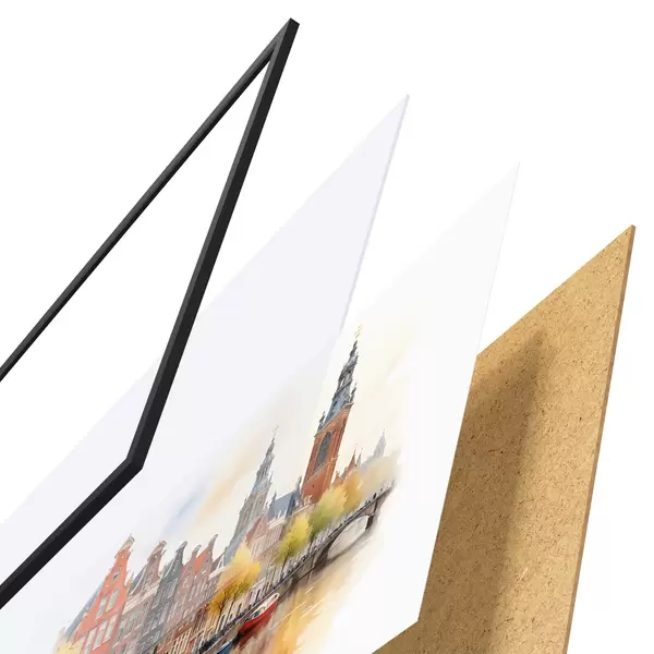 Das Poster besteht aus einem Rahmen, Plexiglas, einem gedruckten Bild und einer Rückwand aus Spanplatten. Dank der Halterungen auf der Rückseite kann das Poster sofort an die Wand gehängt werden.