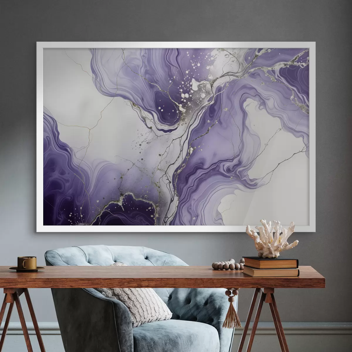 Poster Abstrakter Fluid-Art-Kompositionsdruck mit wirbelnder violetter, weißer und grauer Tinte f40566
