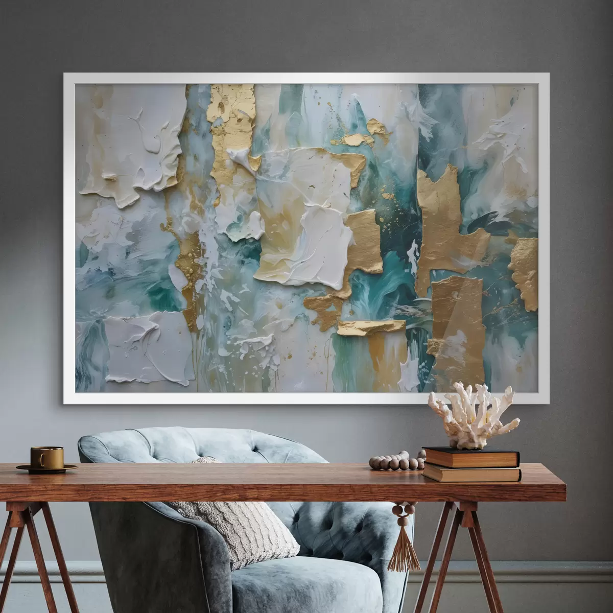 Poster Abblätternde Farbe mit Schichten aus weißen, blauen und gelben Farben, die einen abstrakten, strukturierten Druck erzeugen Nr f40577