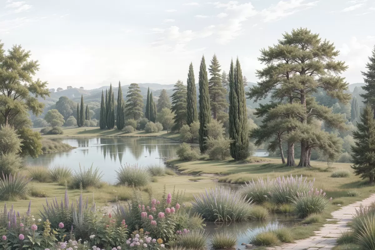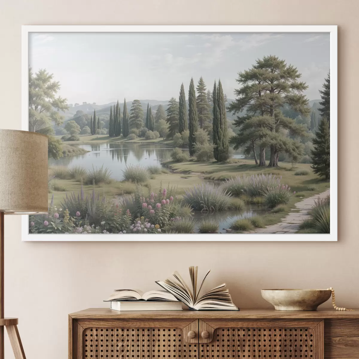 Poster Eine ruhige Landschaft mit einem ruhigen See, umgeben von Kiefern, Zypressen und anderer üppiger Vegetation f40579