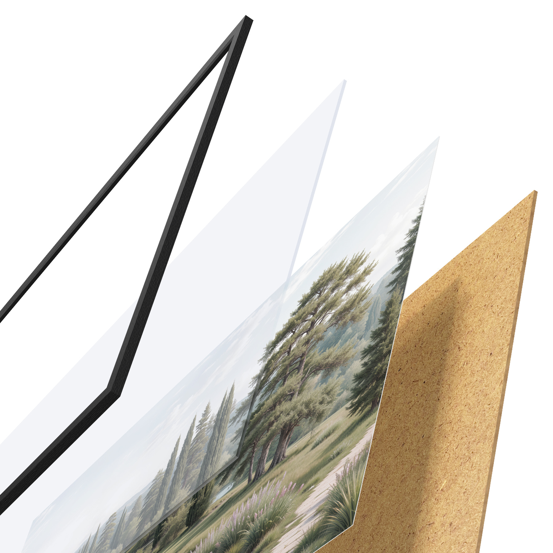 Poster Eine ruhige Landschaft mit einem ruhigen See, umgeben von Kiefern, Zypressen und anderer üppiger Vegetation Nr f40579