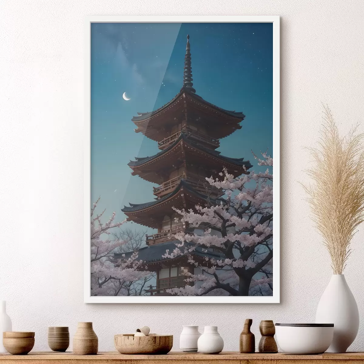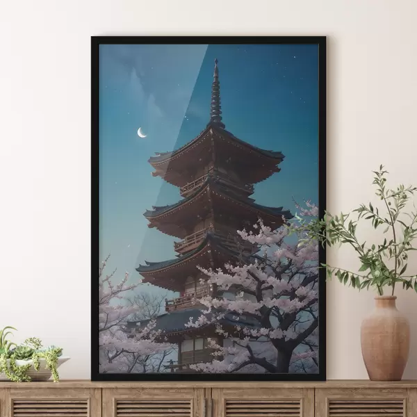 Poster Eine traditionelle japanische Pagode mit einer Mondsichel am Himmel und blühenden Kirschblütenbäumen Nr f40586