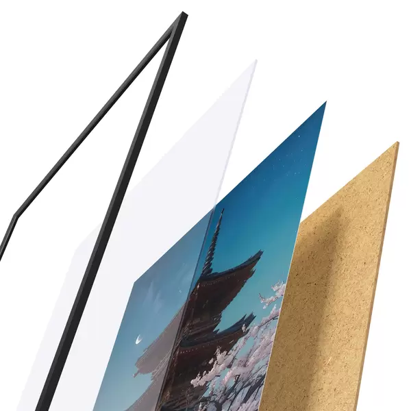 Das Poster besteht aus einem Rahmen, Plexiglas, einem gedruckten Bild und einer Rückwand aus Spanplatten. Dank der Halterungen auf der Rückseite kann das Poster sofort an die Wand gehängt werden.