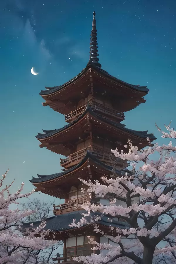 Poster Eine traditionelle japanische Pagode mit einer Mondsichel am Himmel und blühenden Kirschblütenbäumen f40586