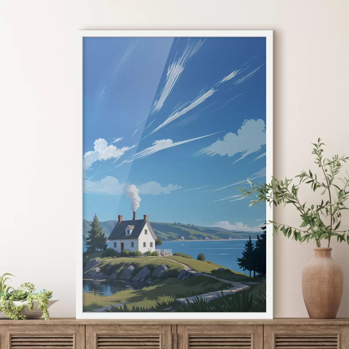 Poster Ein weißes Haus auf einem grasbewachsenen Hügel mit Bergen im Hintergrund und einem blauen Himmel mit Wolkenfetzen Nr f40587