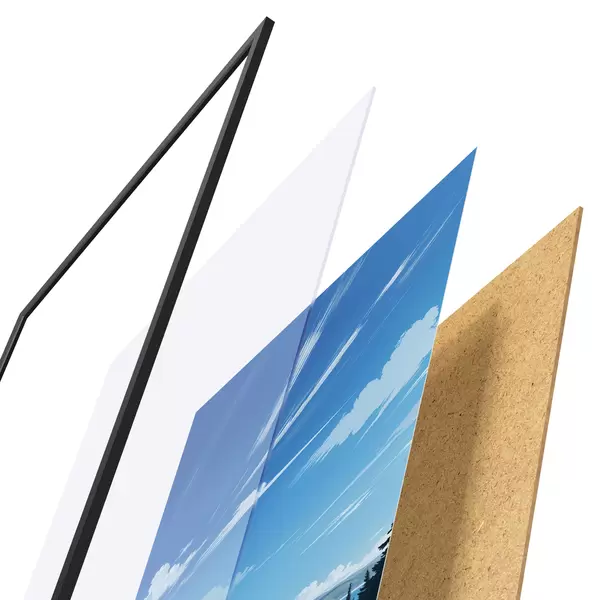 Das Poster besteht aus einem Rahmen, Plexiglas, einem gedruckten Bild und einer Rückwand aus Spanplatten. Dank der Halterungen auf der Rückseite kann das Poster sofort an die Wand gehängt werden.