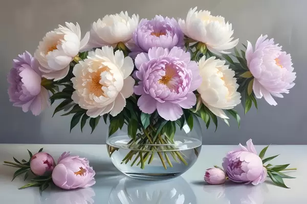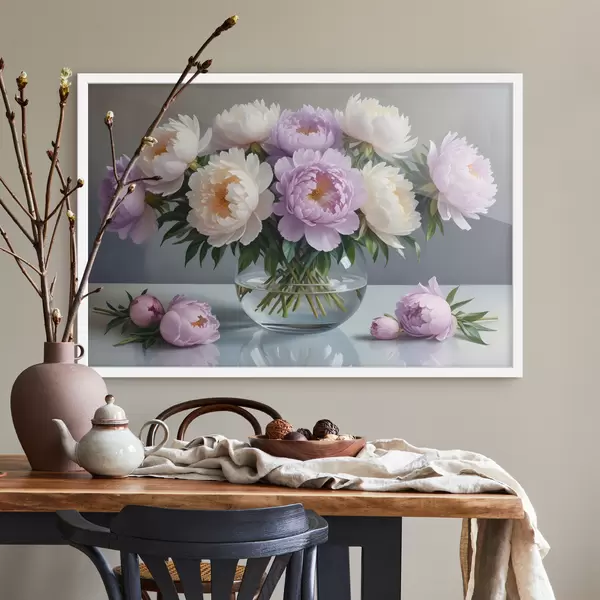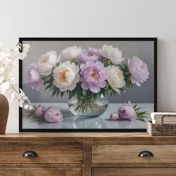 Poster Ein Strauß großer, üppiger weißer und rosa Pfingstrosen in einer Glasvase auf grauem Hintergrund Nr f40610