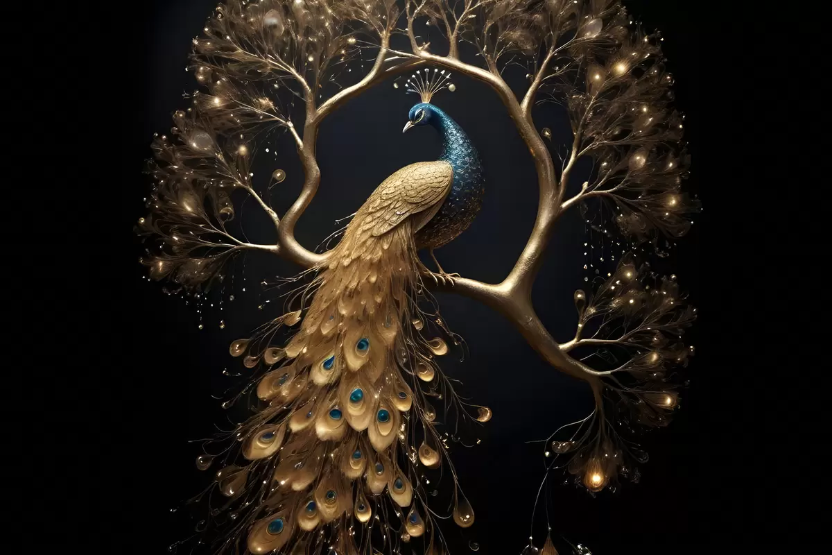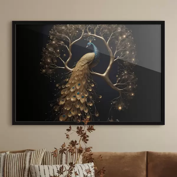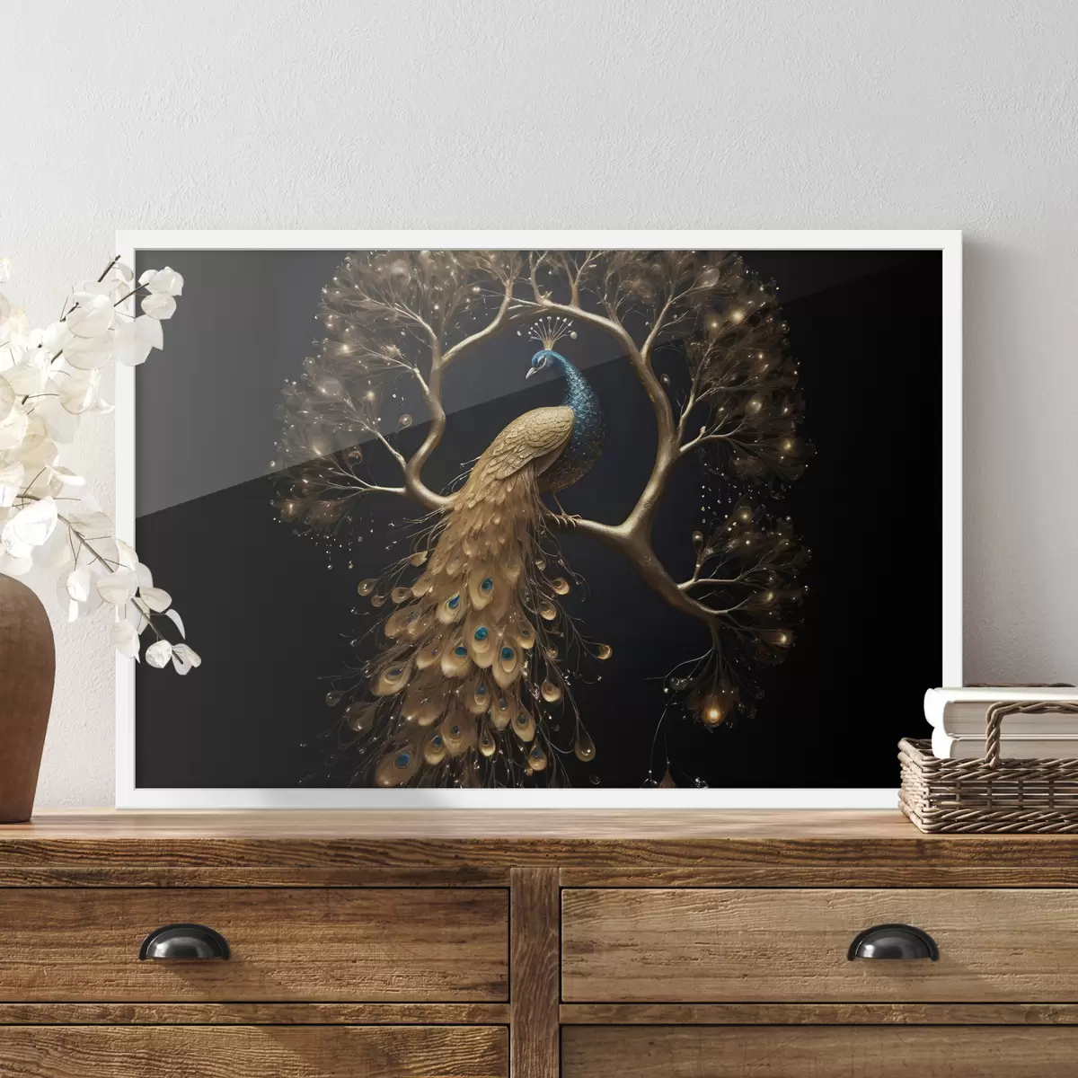 Poster Ein Pfau mit leuchtenden Federn sitzt auf einem Ast vor einem dunklen Hintergrund mit leuchtenden Bäumen Nr f40612