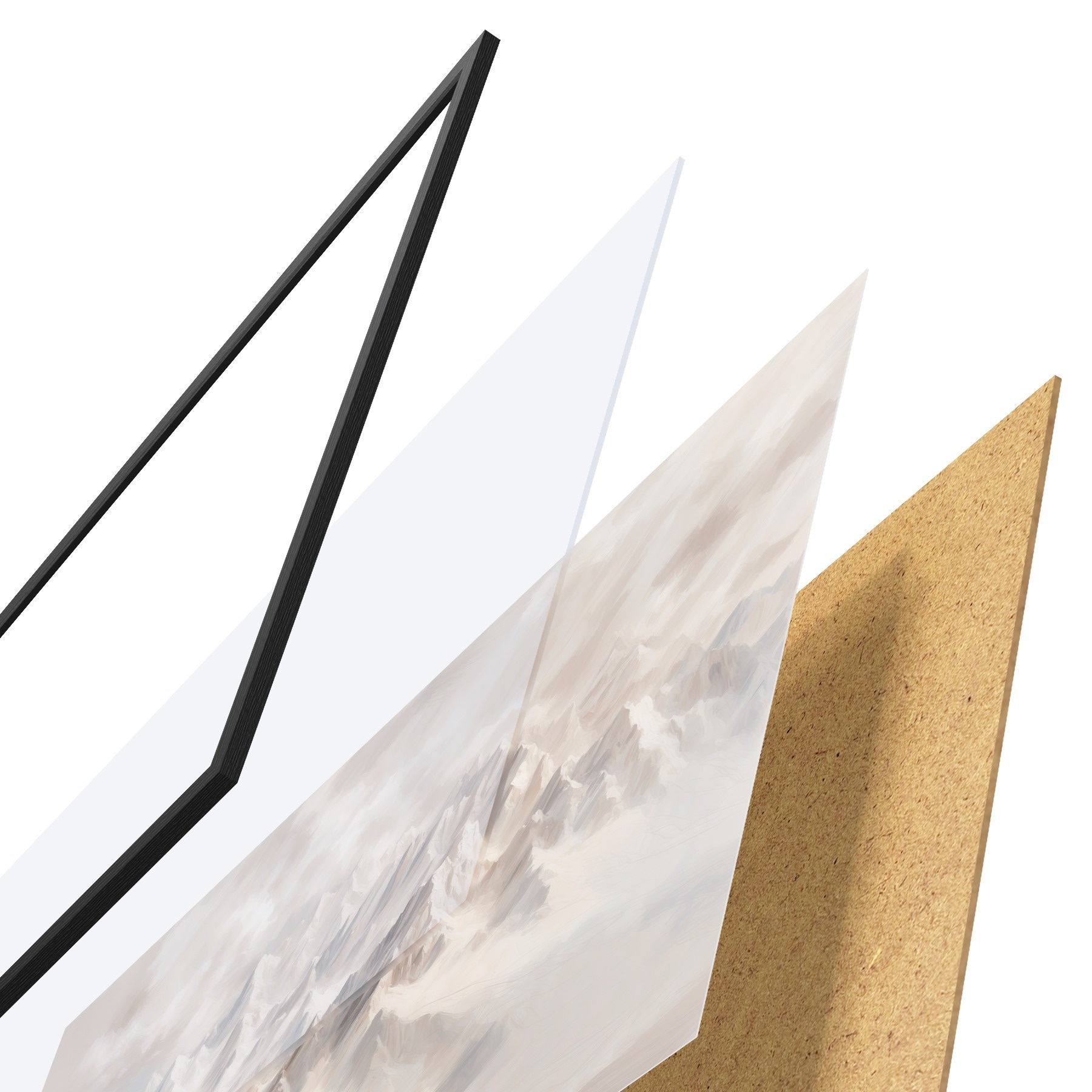 Das Poster besteht aus einem Rahmen, Plexiglas, einem gedruckten Bild und einer Rückwand aus Spanplatten. Dank der Halterungen auf der Rückseite kann das Poster sofort an die Wand gehängt werden.