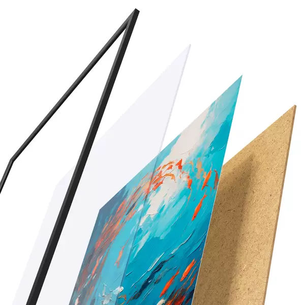 Das Poster besteht aus einem Rahmen, Plexiglas, einem gedruckten Bild und einer Rückwand aus Spanplatten. Dank der Halterungen auf der Rückseite kann das Poster sofort an die Wand gehängt werden.