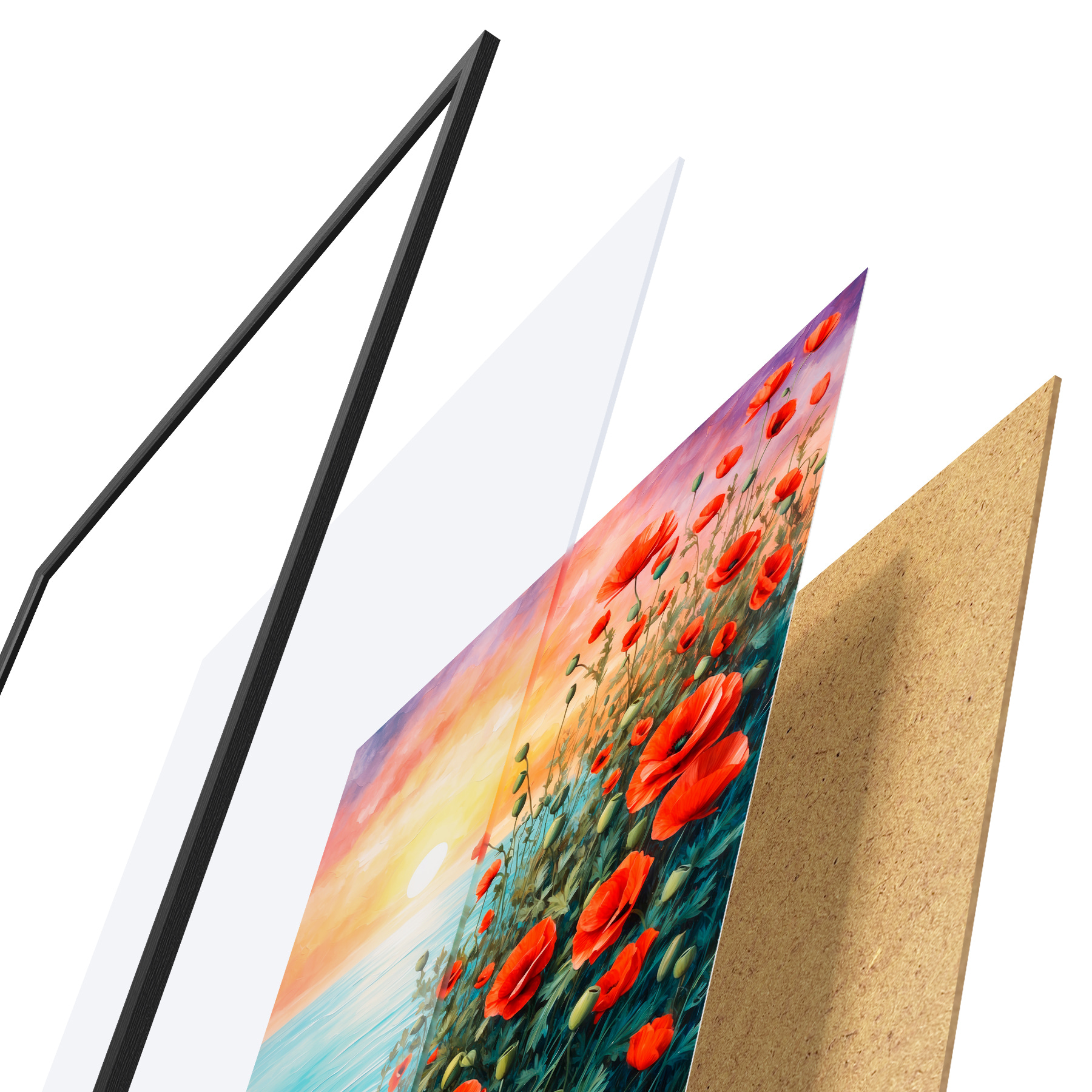 Das Poster besteht aus einem Rahmen, Plexiglas, einem gedruckten Bild und einer Rückwand aus Spanplatten. Dank der Halterungen auf der Rückseite kann das Poster sofort an die Wand gehängt werden.