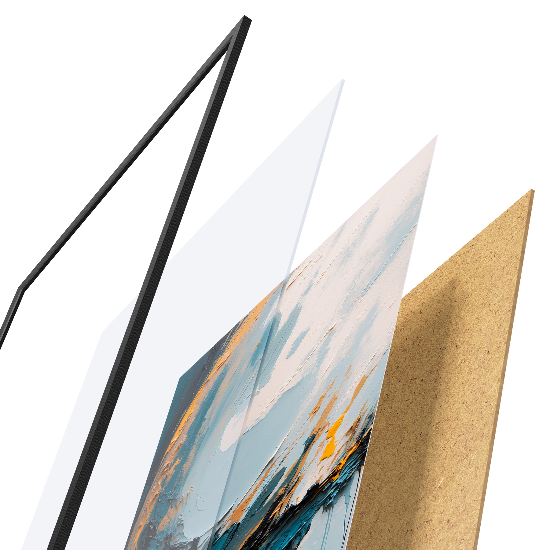Das Poster besteht aus einem Rahmen, Plexiglas, einem gedruckten Bild und einer Rückwand aus Spanplatten. Dank der Halterungen auf der Rückseite kann das Poster sofort an die Wand gehängt werden.