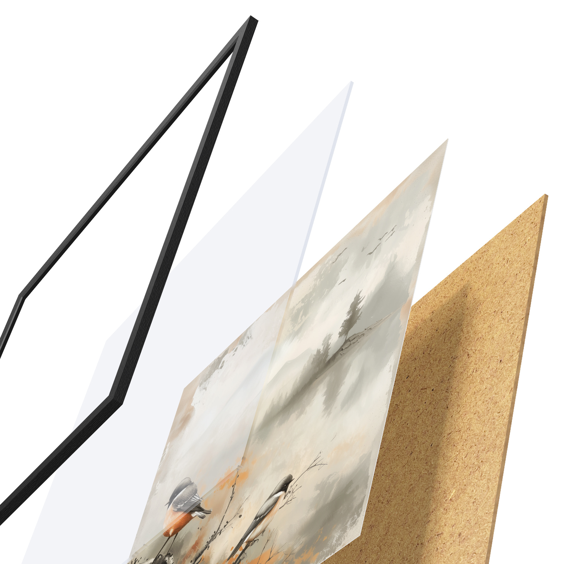 Das Poster besteht aus einem Rahmen, Plexiglas, einem gedruckten Bild und einer Rückwand aus Spanplatten. Dank der Halterungen auf der Rückseite kann das Poster sofort an die Wand gehängt werden.