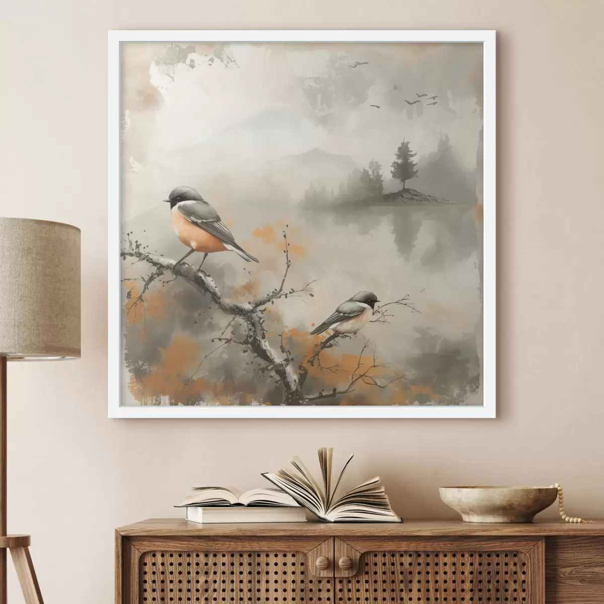 Poster Aquarelllandschaft mit Vögeln, die auf einem Zweig sitzen, in Pastellfarben Nr f40655