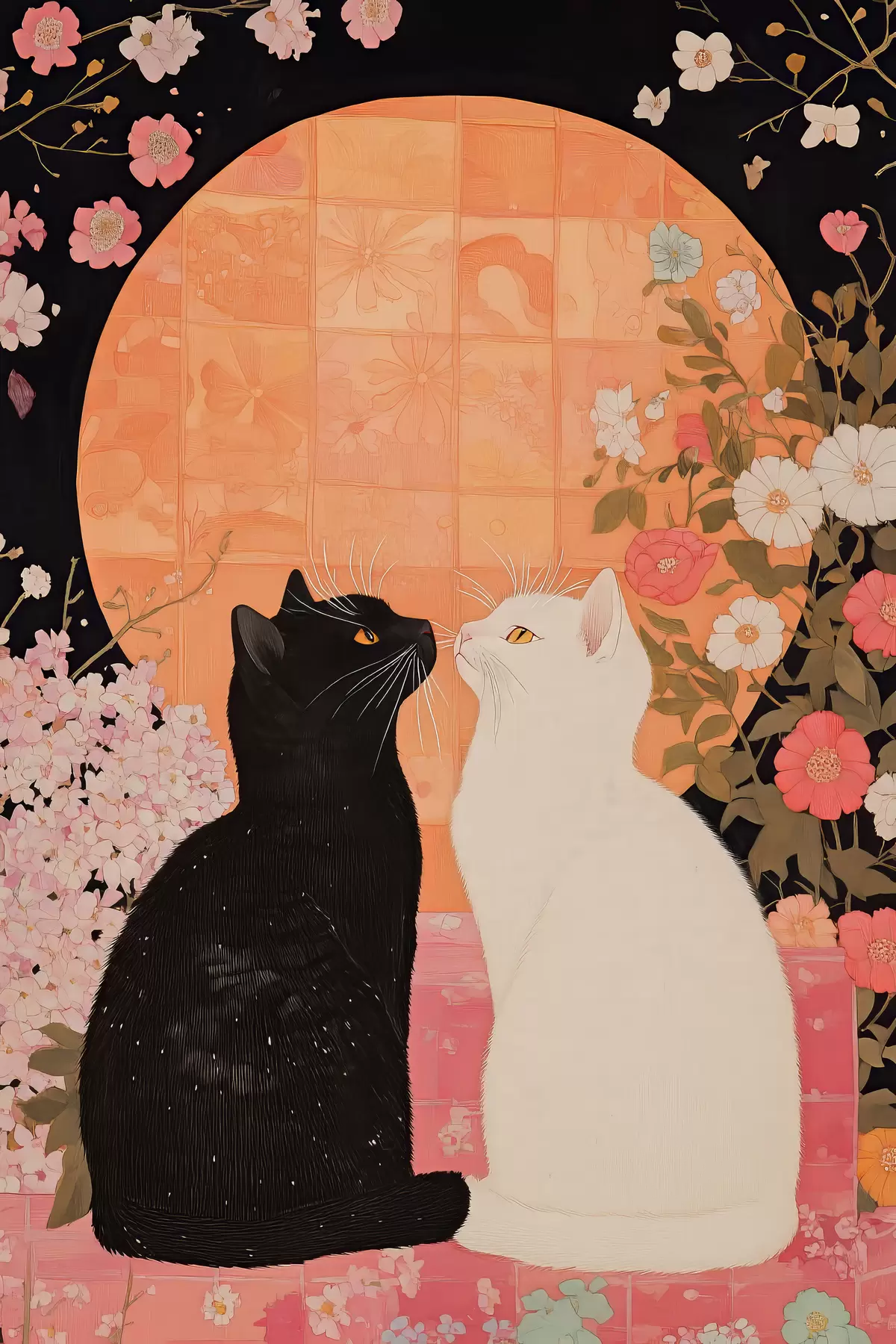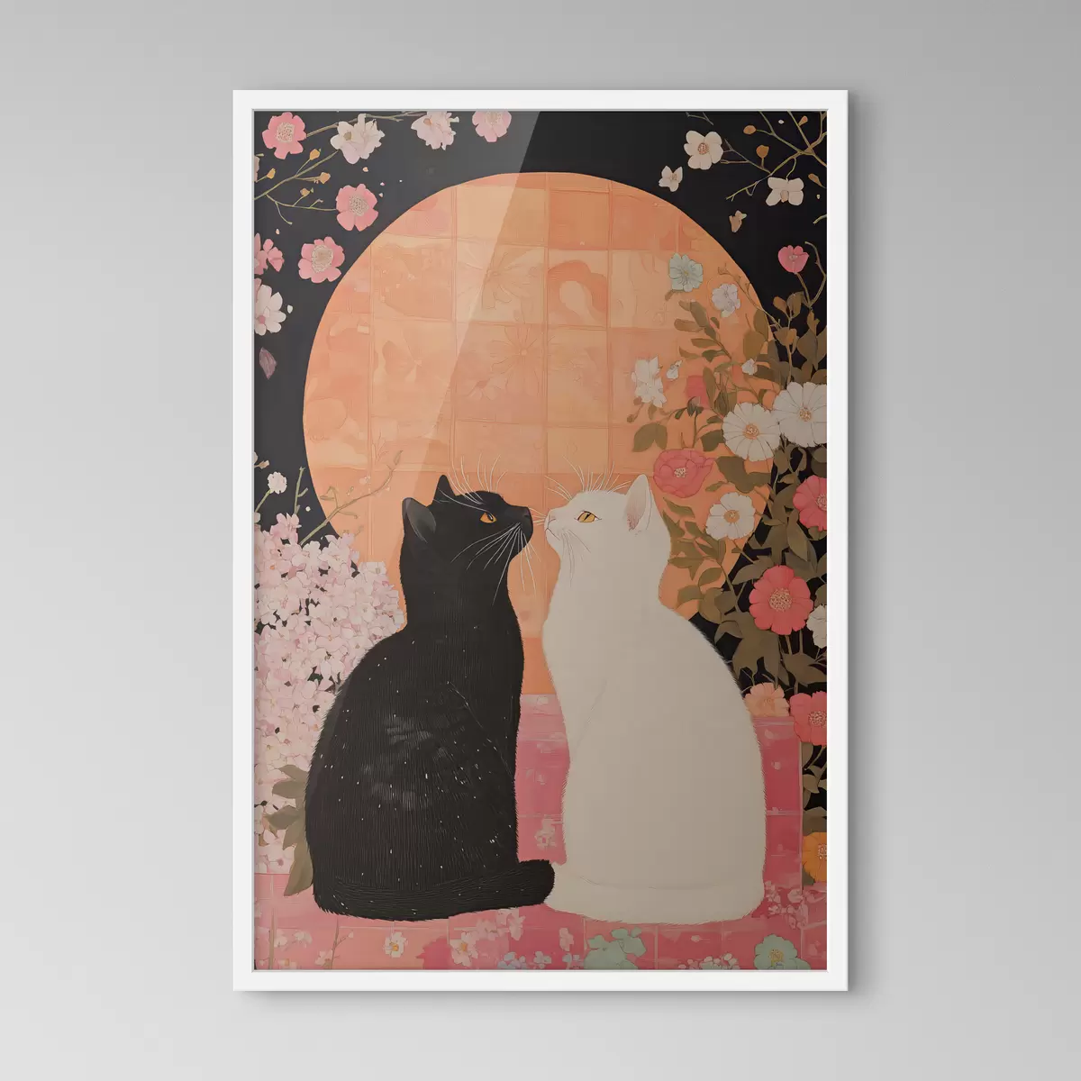 Poster Schwarze und weiße Katze schauen sich bei Sonnenuntergang niedlich an Nr f40669