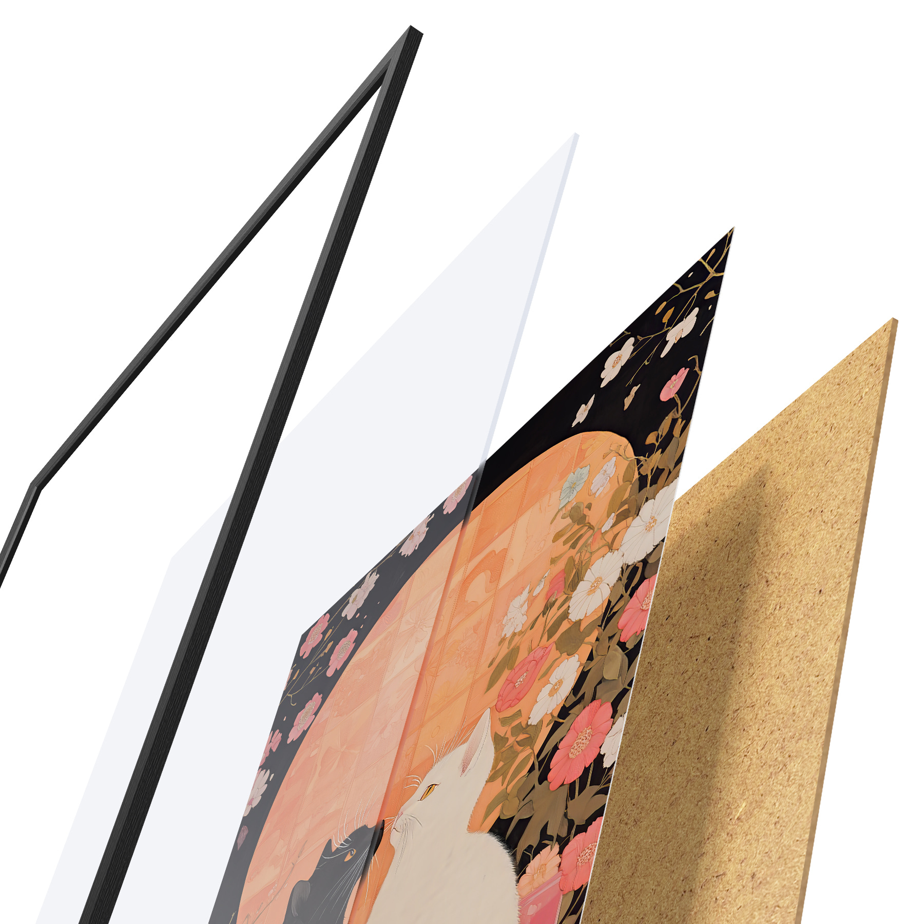 Poster Schwarze und weiße Katze schauen sich bei Sonnenuntergang niedlich an f40669