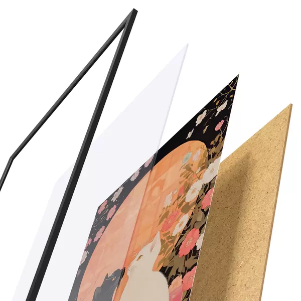 Das Poster besteht aus einem Rahmen, Plexiglas, einem gedruckten Bild und einer Rückwand aus Spanplatten. Dank der Halterungen auf der Rückseite kann das Poster sofort an die Wand gehängt werden.