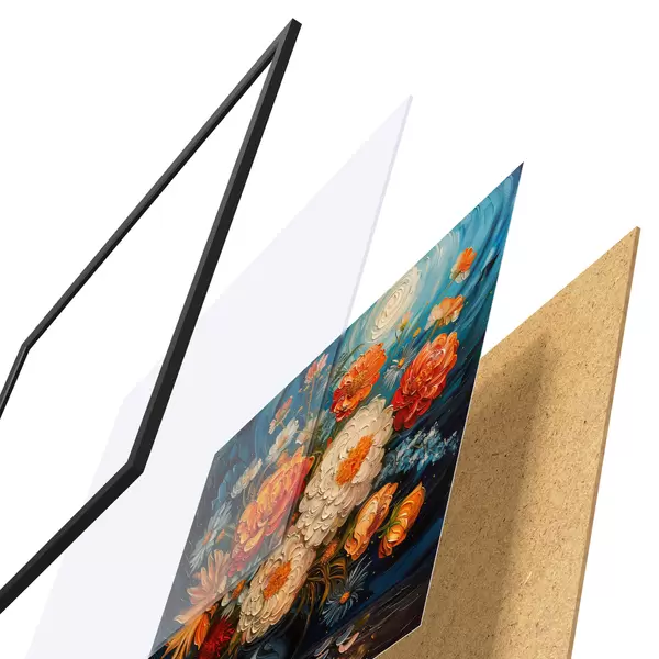 Das Poster besteht aus einem Rahmen, Plexiglas, einem gedruckten Bild und einer Rückwand aus Spanplatten. Dank der Halterungen auf der Rückseite kann das Poster sofort an die Wand gehängt werden.