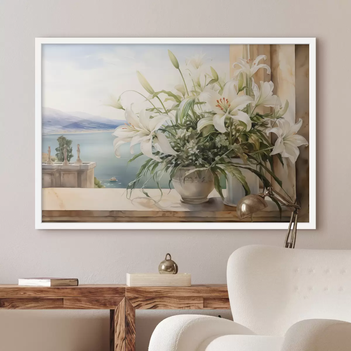 Poster Weiße Lilien in einer Vase auf einem Balkon mit Blick auf das Meer und die Berge Aquarell f40682