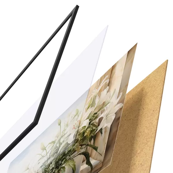 Das Poster besteht aus einem Rahmen, Plexiglas, einem gedruckten Bild und einer Rückwand aus Spanplatten. Dank der Halterungen auf der Rückseite kann das Poster sofort an die Wand gehängt werden.