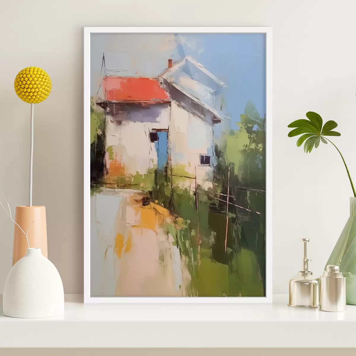 Poster Abstrakte Landschaft Haus durch den Garten, rot, blau, grün, gelb Farbe f40689