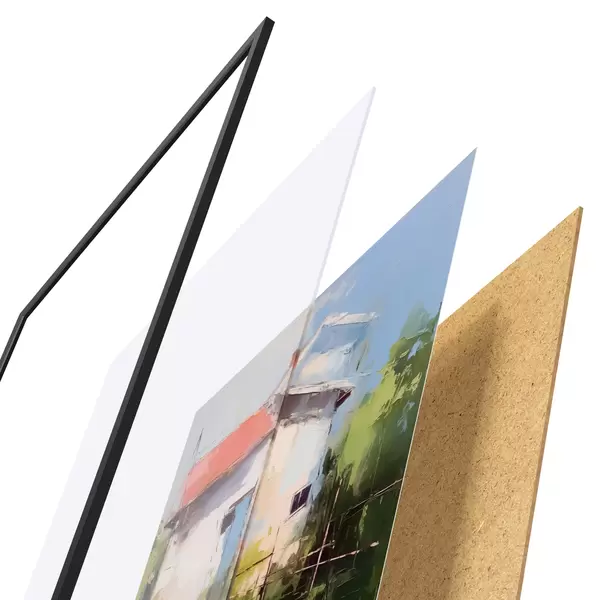 Das Poster besteht aus einem Rahmen, Plexiglas, einem gedruckten Bild und einer Rückwand aus Spanplatten. Dank der Halterungen auf der Rückseite kann das Poster sofort an die Wand gehängt werden.