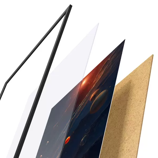 Das Poster besteht aus einem Rahmen, Plexiglas, einem gedruckten Bild und einer Rückwand aus Spanplatten. Dank der Halterungen auf der Rückseite kann das Poster sofort an die Wand gehängt werden.