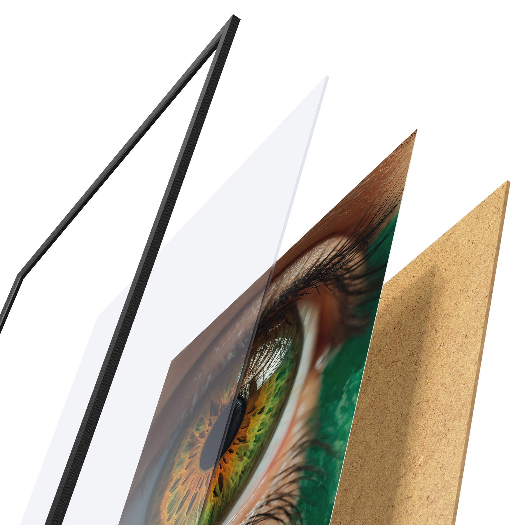 Das Poster besteht aus einem Rahmen, Plexiglas, einem gedruckten Bild und einer Rückwand aus Spanplatten. Dank der Halterungen auf der Rückseite kann das Poster sofort an die Wand gehängt werden.
