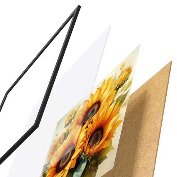 Das Poster besteht aus einem Rahmen, Plexiglas, einem gedruckten Bild und einer Rückwand aus Spanplatten. Dank der Halterungen auf der Rückseite kann das Poster sofort an die Wand gehängt werden.