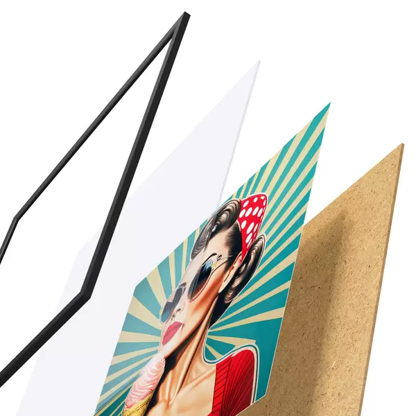 Das Poster besteht aus einem Rahmen, Plexiglas, einem gedruckten Bild und einer Rückwand aus Spanplatten. Dank der Halterungen auf der Rückseite kann das Poster sofort an die Wand gehängt werden.