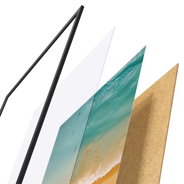 Das Poster besteht aus einem Rahmen, Plexiglas, einem gedruckten Bild und einer Rückwand aus Spanplatten. Dank der Halterungen auf der Rückseite kann das Poster sofort an die Wand gehängt werden.