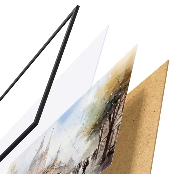 Das Poster besteht aus einem Rahmen, Plexiglas, einem gedruckten Bild und einer Rückwand aus Spanplatten. Dank der Halterungen auf der Rückseite kann das Poster sofort an die Wand gehängt werden.