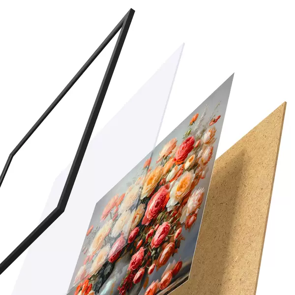 Das Poster besteht aus einem Rahmen, Plexiglas, einem gedruckten Bild und einer Rückwand aus Spanplatten. Dank der Halterungen auf der Rückseite kann das Poster sofort an die Wand gehängt werden.