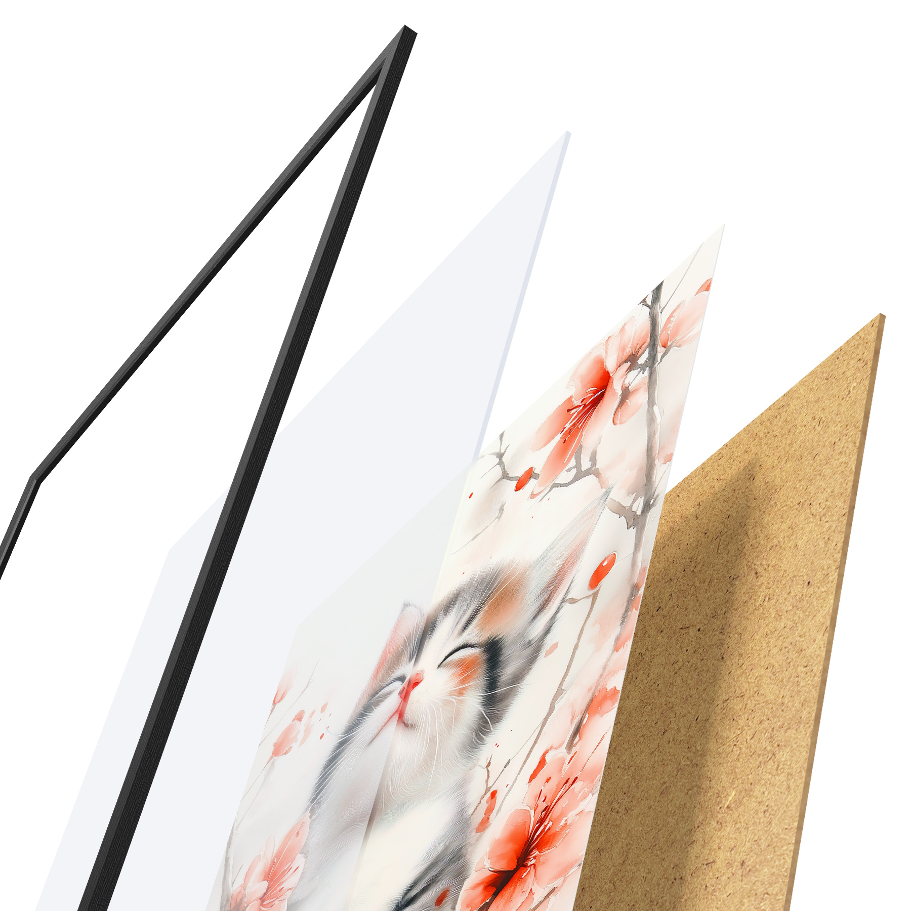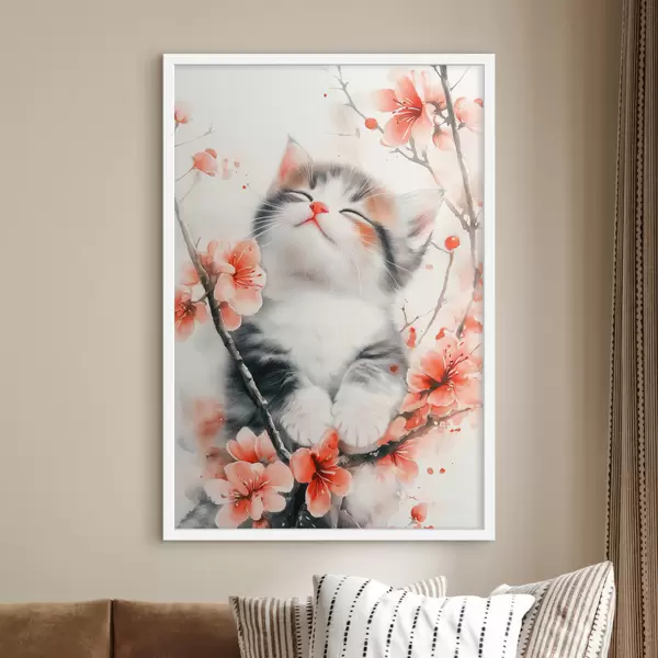 Poster Niedliches Kätzchen auf einem Zweig mit Blumen Nr f40734