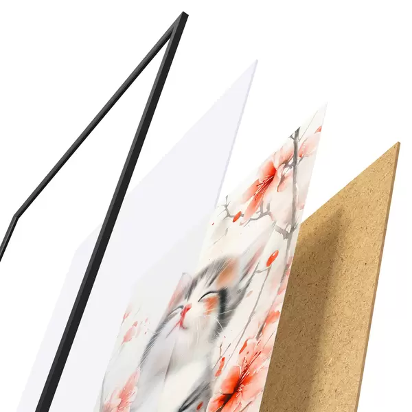 Das Poster besteht aus einem Rahmen, Plexiglas, einem gedruckten Bild und einer Rückwand aus Spanplatten. Dank der Halterungen auf der Rückseite kann das Poster sofort an die Wand gehängt werden.