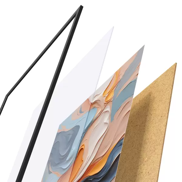 Das Poster besteht aus einem Rahmen, Plexiglas, einem gedruckten Bild und einer Rückwand aus Spanplatten. Dank der Halterungen auf der Rückseite kann das Poster sofort an die Wand gehängt werden.