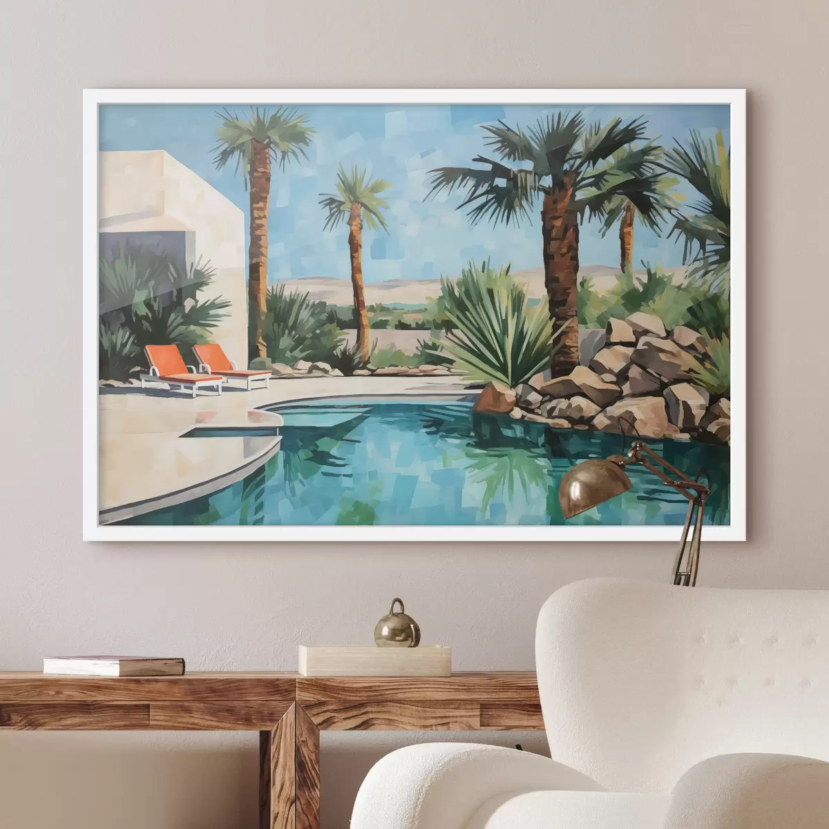 Poster Palmen in der Nähe des Hotels mit einem Schwimmbad in der Nähe der Felsen, blau, grün, rot Farbe f40748