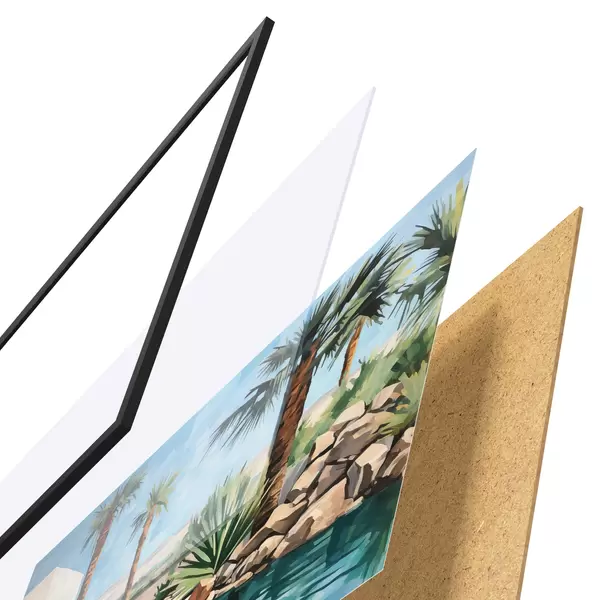 Das Poster besteht aus einem Rahmen, Plexiglas, einem gedruckten Bild und einer Rückwand aus Spanplatten. Dank der Halterungen auf der Rückseite kann das Poster sofort an die Wand gehängt werden.