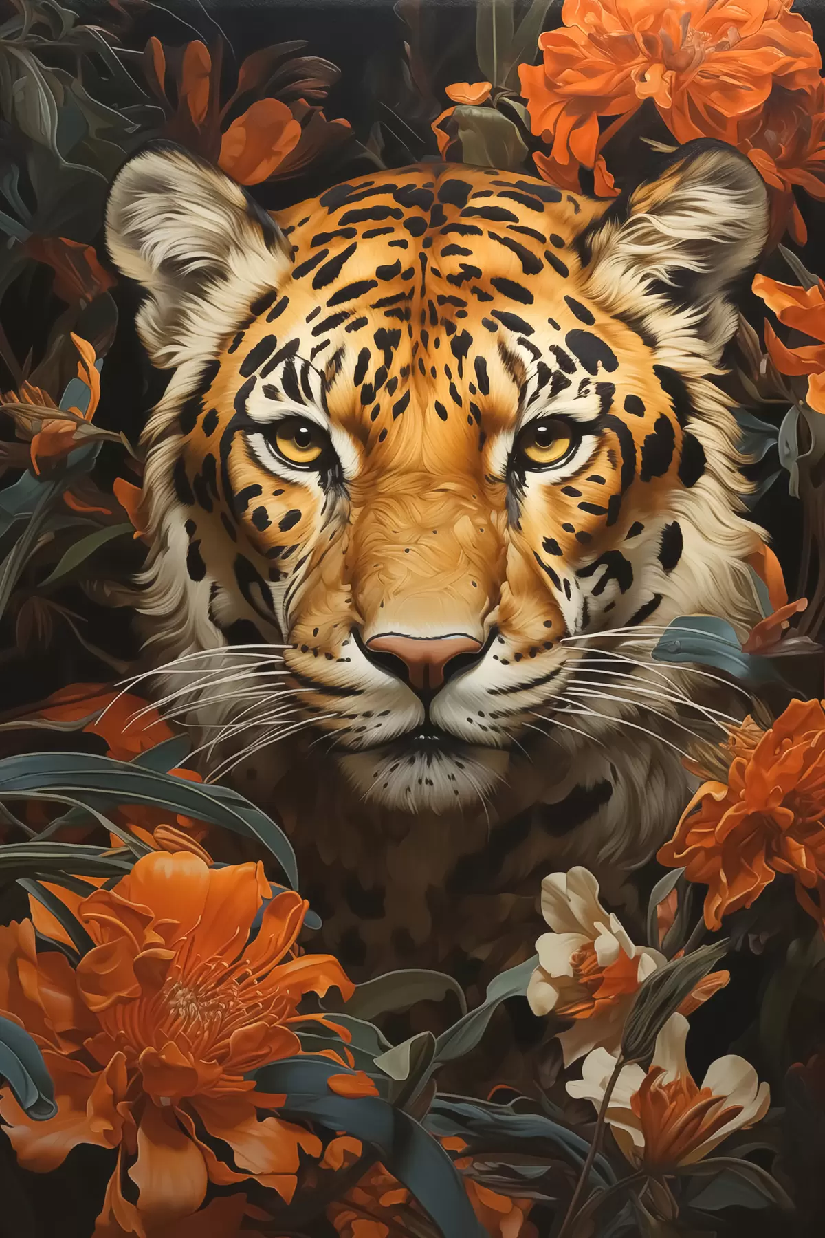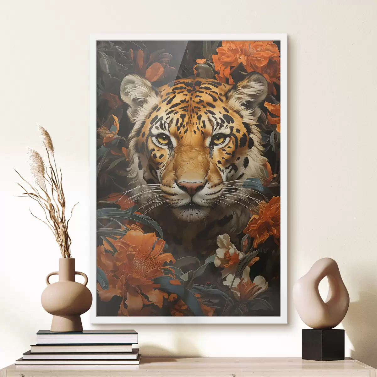 Poster Porträt eines Tigers, umgeben von tropischen Blumen Nr f40757