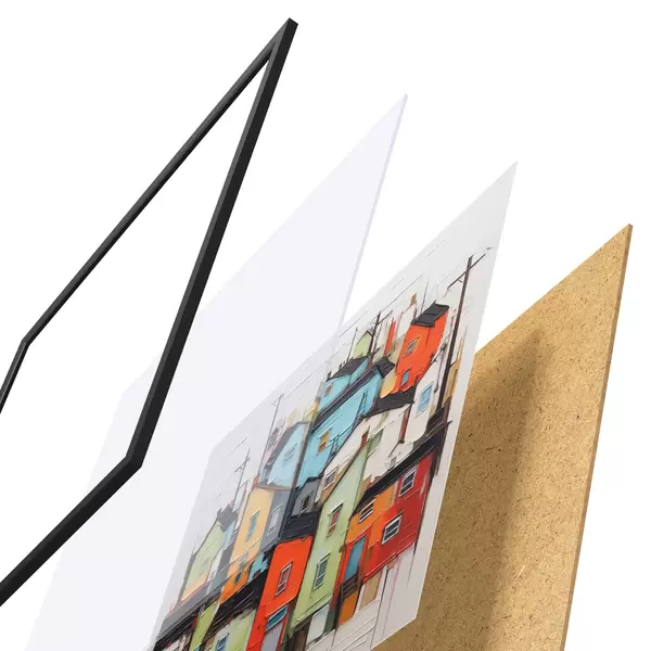Das Poster besteht aus einem Rahmen, Plexiglas, einem gedruckten Bild und einer Rückwand aus Spanplatten. Dank der Halterungen auf der Rückseite kann das Poster sofort an die Wand gehängt werden.