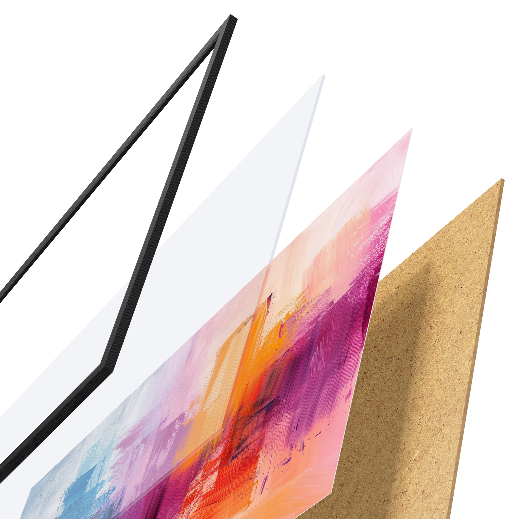 Das Poster besteht aus einem Rahmen, Plexiglas, einem gedruckten Bild und einer Rückwand aus Spanplatten. Dank der Halterungen auf der Rückseite kann das Poster sofort an die Wand gehängt werden.